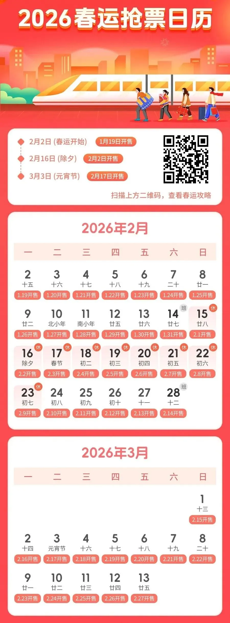 春运期间的车票售出较快,大家记得提前看好对应车票提前准备购买,春运期间抢票日历: