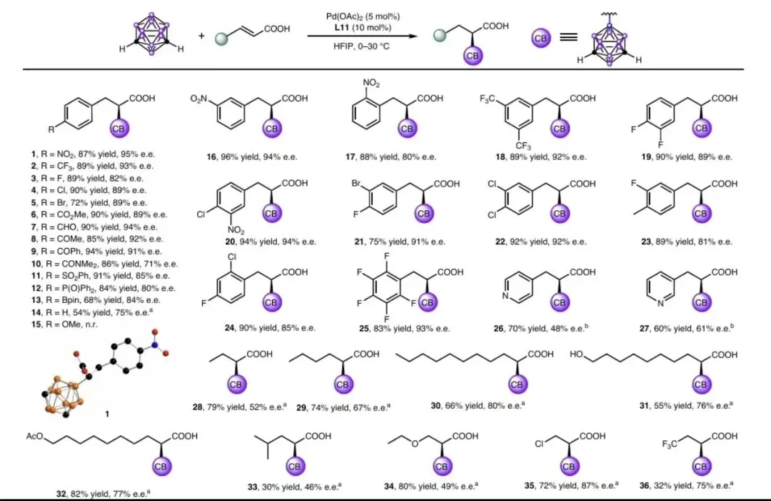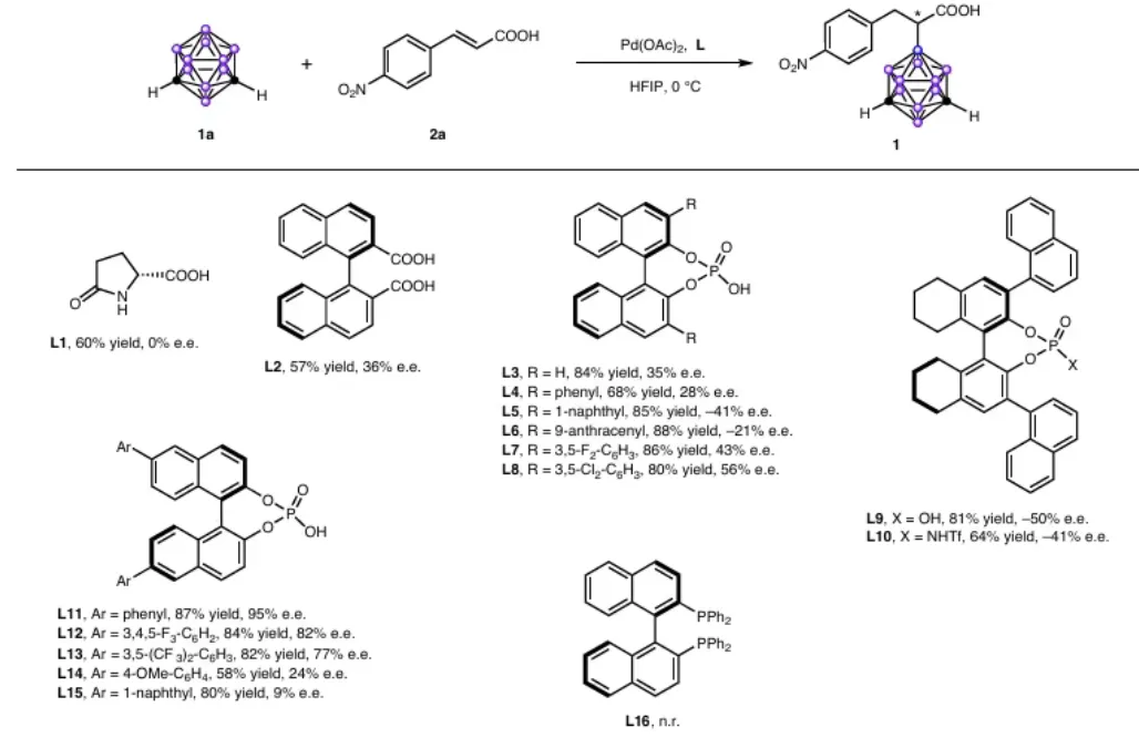 反应条件: 碳硼烷(0.105 mmo)、4-硝基肉桂酸(0.1mmol)、Pd (OAc)(0.005 mmol, 5mol%)、Ll (0.01mmol,10mol%)置于HFIP(5ml)中,在空气氛围下进行。所分离产物的收率和e.e.值均通过手性高效液相色谱法测定。