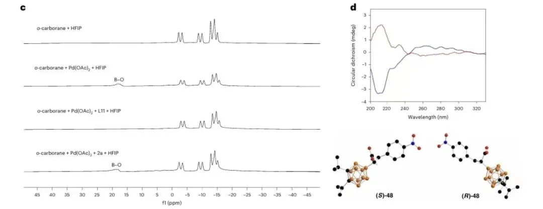 图7a:对照实验;图7b,氘标记实验。图7c,不同复合物的BNMR图谱。图d,CH,CN(c=0.1mgml1)中(S) -46(蓝色)和(R) -46(红色)的圆二色谱光谱以及(S)-48和(R)-48的分子结构。可能的区域和立体选择性路径的相对吉布斯能量分布情况,采用IEF-PCMary//M06-L/Lanl2DZa/6-31G(d.p)/EF-PCM (a)水平