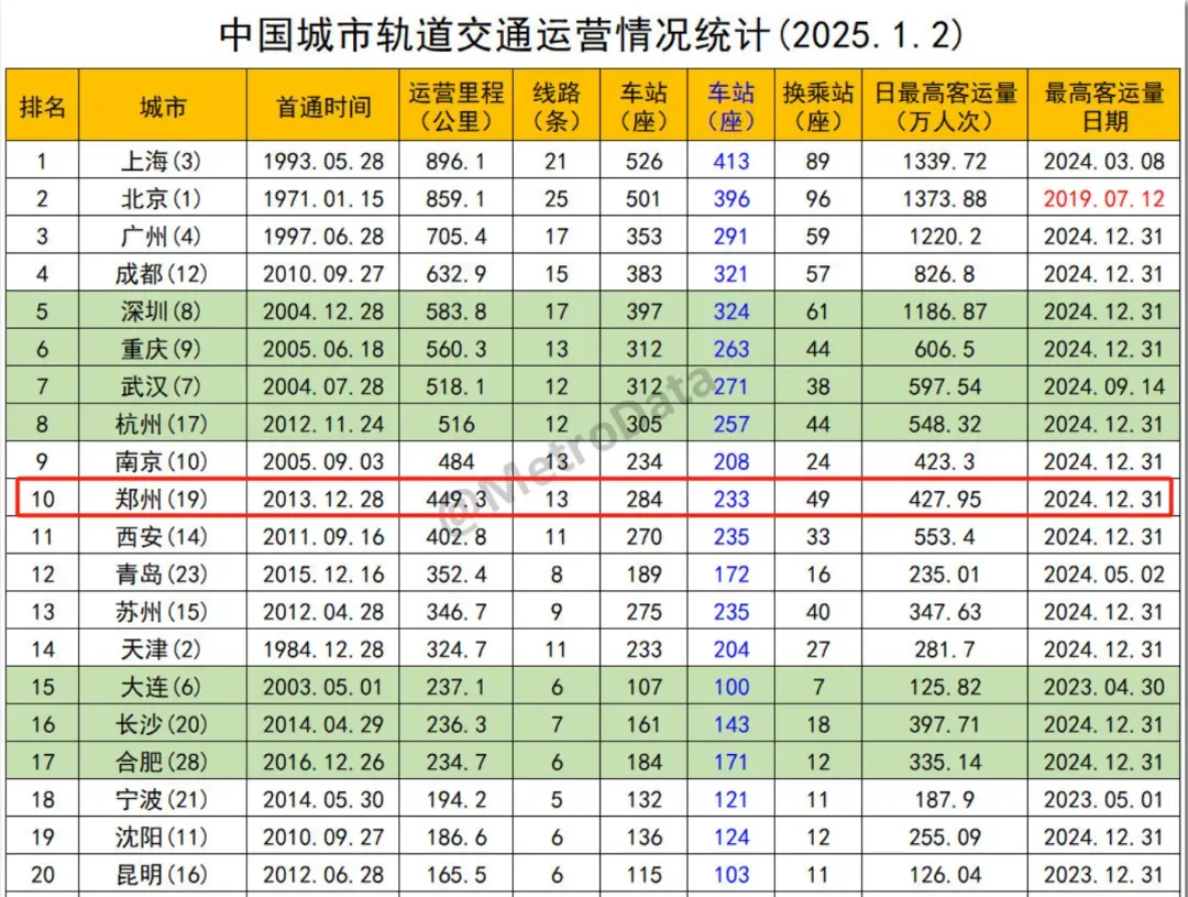 2024年,郑州新增地铁运营里程100多公里。郑州也凭借452公里的地铁运营里程,碾压天津、青岛、西安等城市,进入了全国前十强。