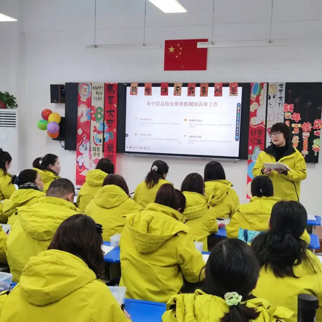 活动伊始,学校各部门中层干部依次发言,就寒假期间的安全管理、学习提升及日常事务等工作进行了周密安排与详细解读,确保全体师生度过一个平安、充实的假期。随后,陈莹校长发表致辞,全面回顾并总结了本学期学校各项工作的成绩与经验,对老师们的辛勤付出表示衷心感谢,同时就假期相关重点任务作出部署,并向全体教师送上诚挚的新春祝福。