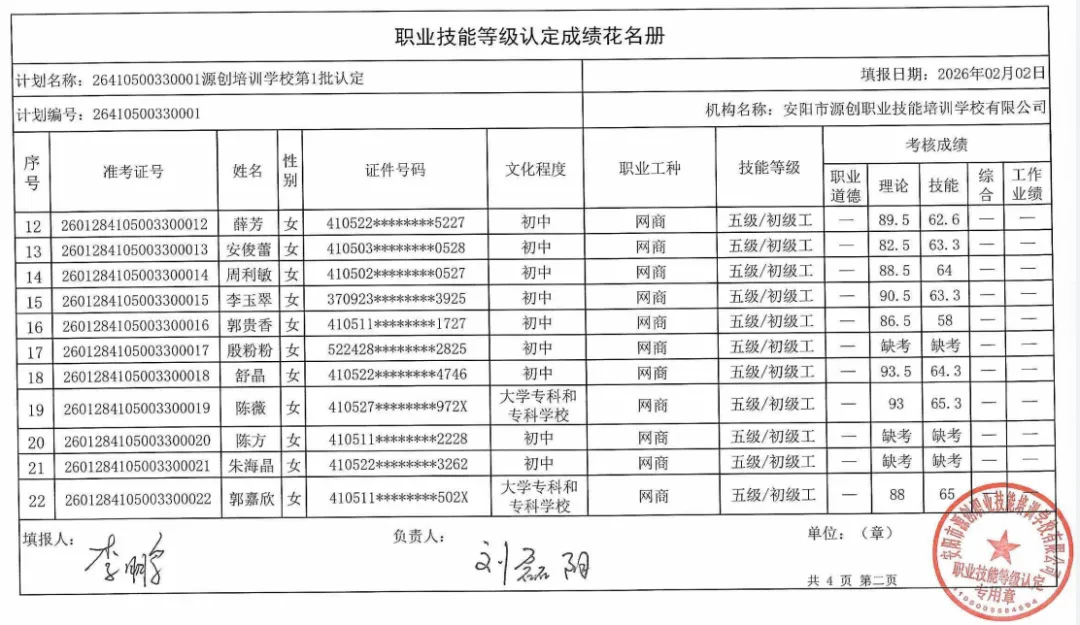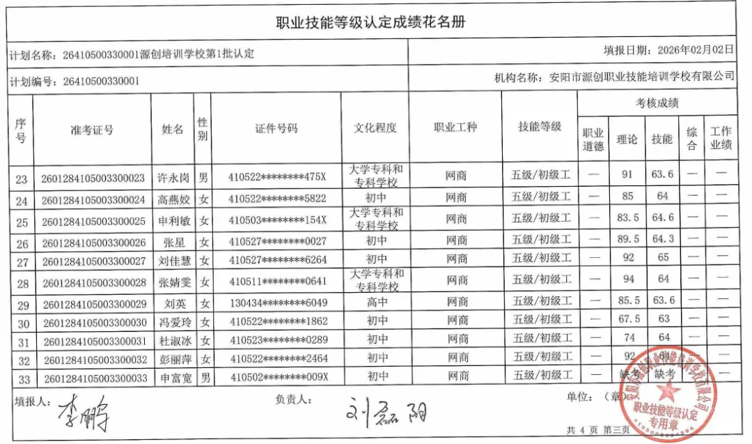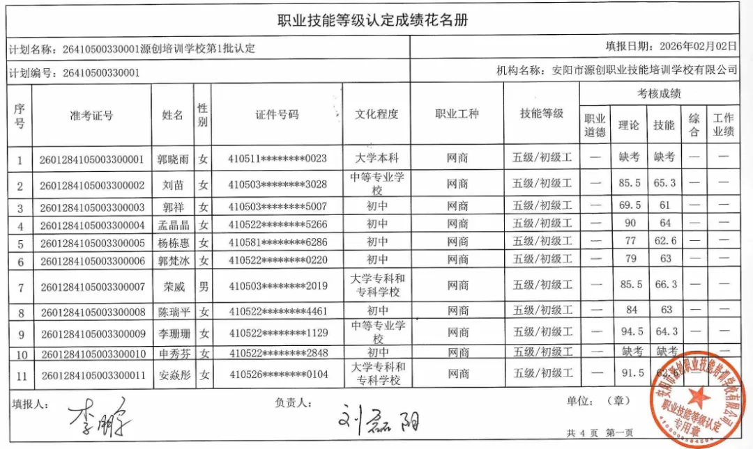 >安阳市源创职业培训学校2026年第1批职业技能等级认定成绩公示