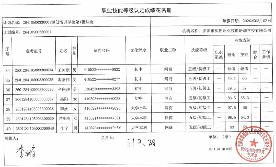 2026年2月2日安阳市源创职业技能培训学校第1批职业技能等级认定工作圆满结束,本批考试学员共计40人,考试职业工种为初级电子商务师现将考试学员成绩予以公示。