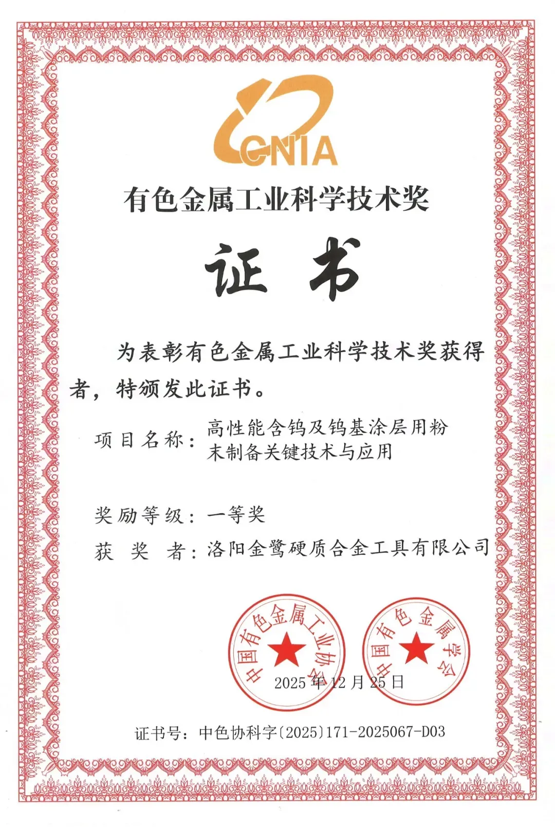 2025年12月25日,备受业界关注的2025年度有色金属工业科学技术奖授奖项目公示,洛阳金鹭凭借其在行业的卓越表现与突出成就,强势登榜,荣获有色金属工业科学技术奖—一等奖。