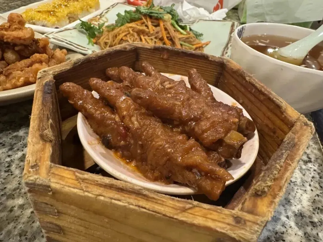 作为这里的“顶流”,小街天府从早到晚都有人排队。招牌担担面麻辣鲜香,面条劲道;豉汁凤爪软烂脱骨,咸香适口;特色涮串卤味十足、辣得过瘾;还有油炸小酥肉、红糖糍粑、桂花小米凉糕......