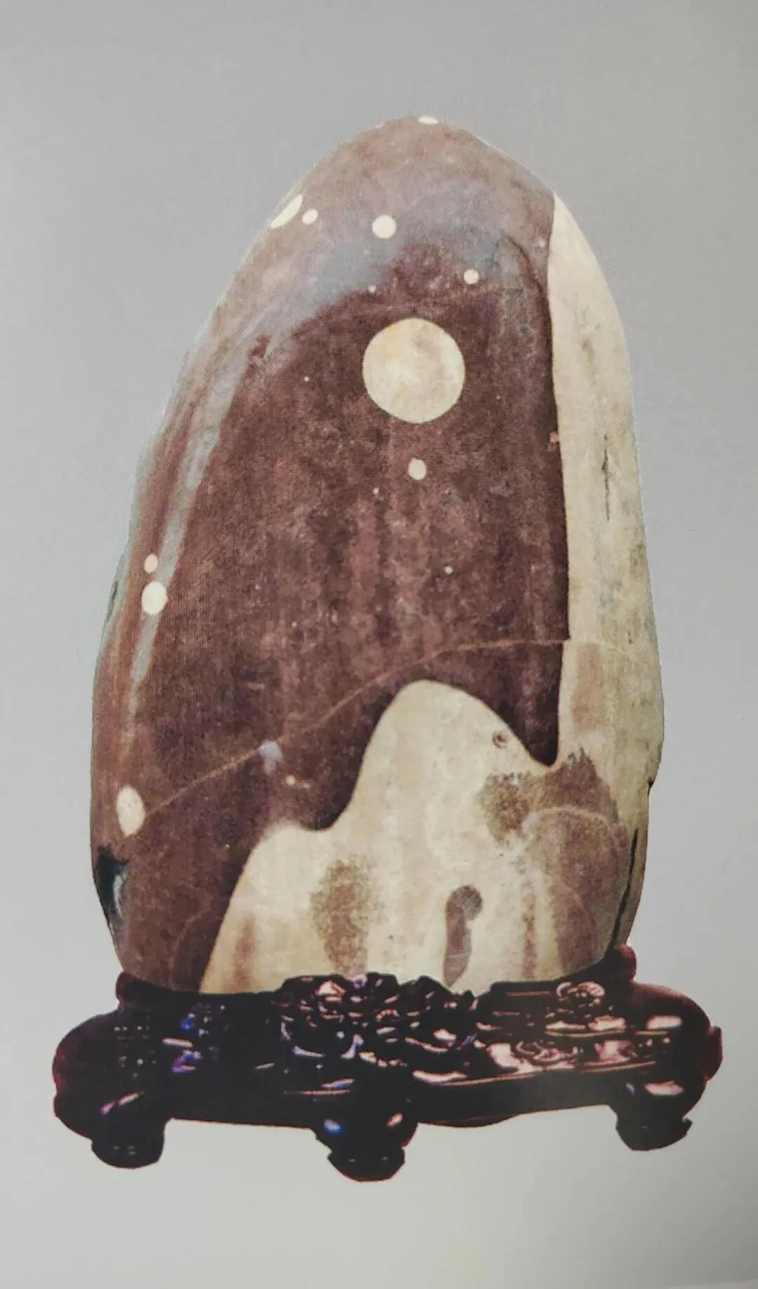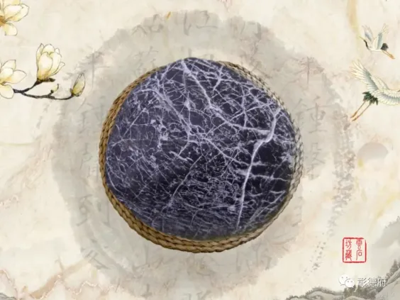 《云林石谱》记载,“梨园石:相州之北数十里,地名梨园。漳河水中出石数种,或如浓墨圆点成纹,或深黄匾头,颇坚润。土人谓之姜鼓石。堪琢为器物,亦磨作镇纸,其价甚廉。”梨园石的色彩虽然不算太丰富,但图纹变化却是多样的,由褐红、浅黄、浅灰、黑灰等色彩组成了人物、动物、植物、文字等图案,特别是日月星辰图案令人叫绝。