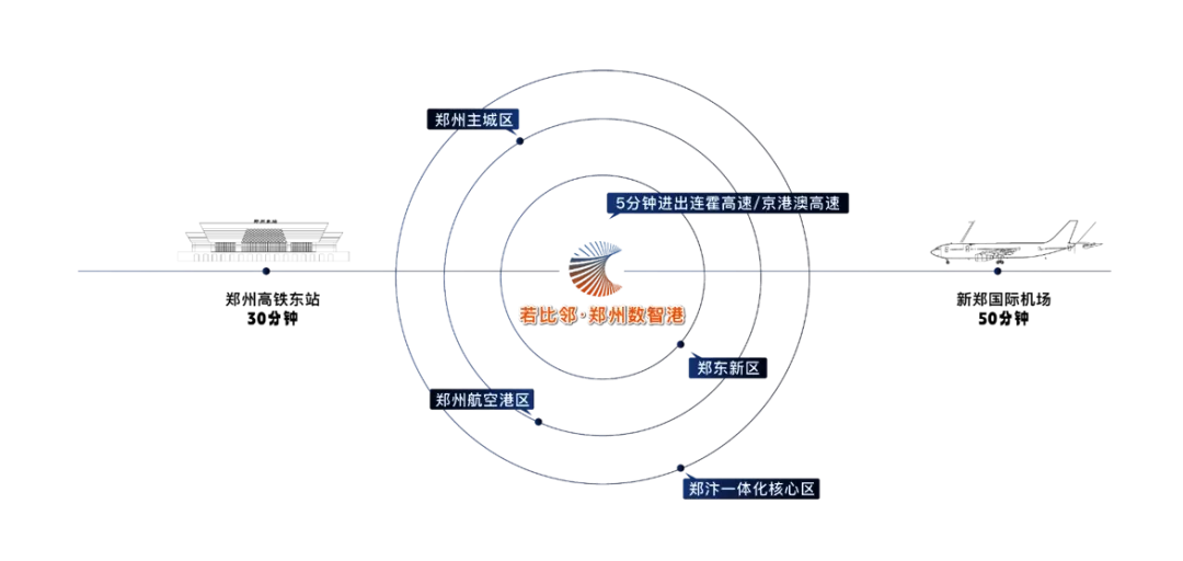 金水科教园区作为郑州承接郑东新区、北龙湖核心价值外溢的重点板块,坐拥得天独厚的区位优势。若比邻·郑州数智港便落址于此核心腹地,紧邻北龙湖圈与中原科技城,深度共享区域发展红利。项目交通配套与郑州枢纽体系无缝衔接:1公里直达东三环城市快速路,2公里接驳连霍高速,9公里直通郑州高铁东站,36公里链接新郑国际机场,多维路网实现了与全国乃至全球的高效通达。