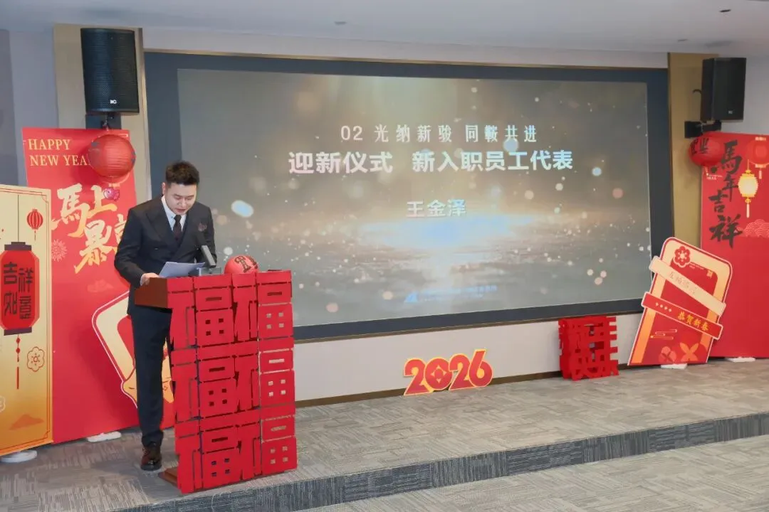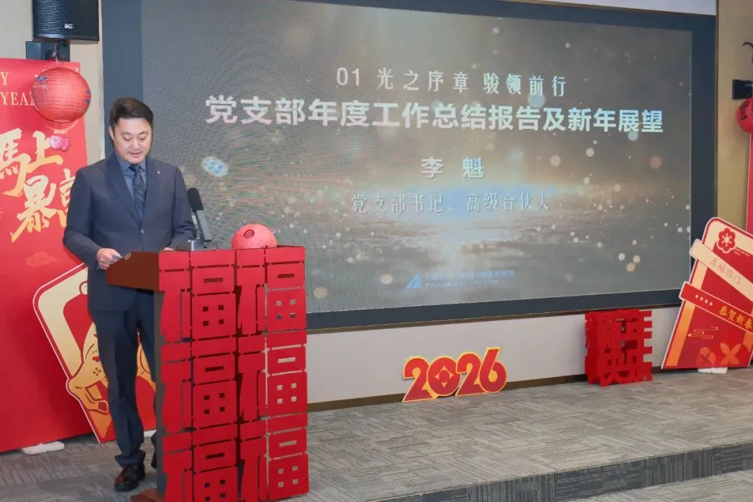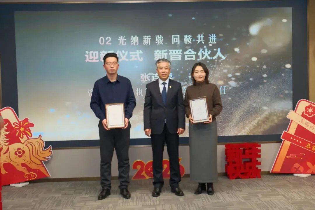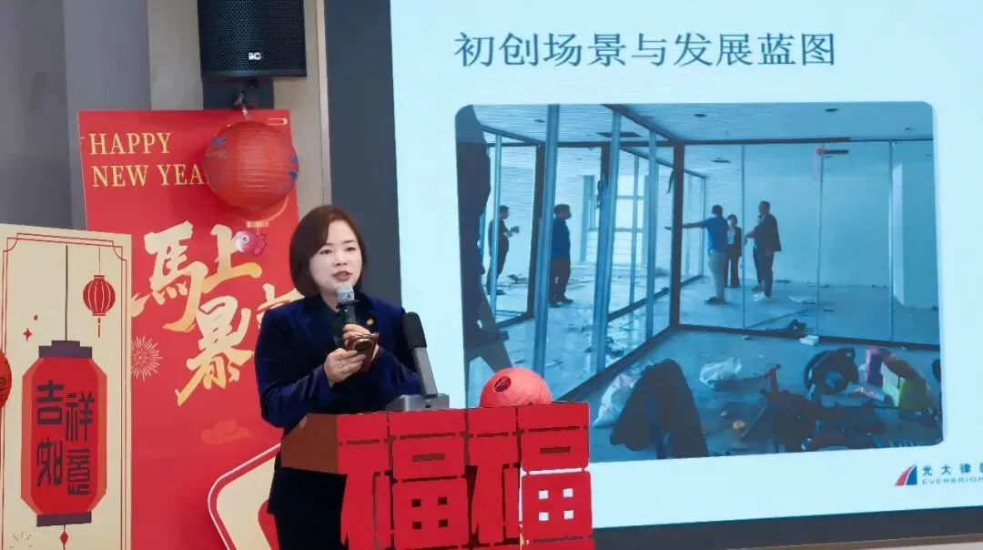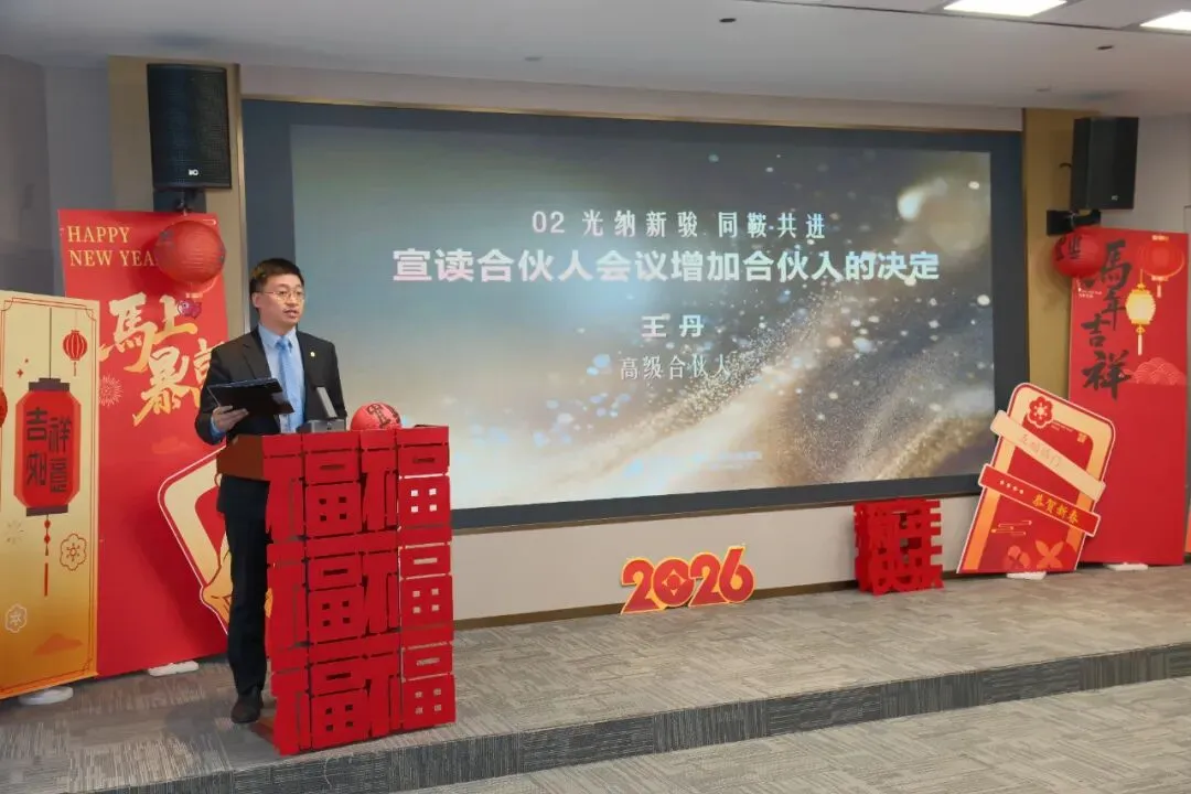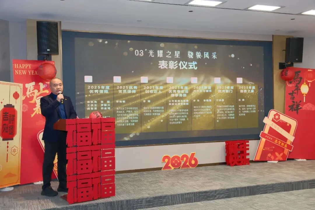 本次年终总结会由律所行政部主任、高级合伙人郭雨辰主持。律所主任王纯首先作年度工作总结报告,全面回顾了律所在专业化建设、业务拓展、品牌影响力提升等方面取得的突破性进展,并对2026年的律所发展方向作出清晰规划,激励光大郑州所全体同仁在新的一年中继续乘风破浪、再创佳绩。党支部书记、高级合伙人李魁随后总结了党支部年度工作成果,强调党建引领在律所文化塑造与业务发展中的核心作用,表示将持续推进党建与所建的深度融合,推动律所高质量发展。业务部主任、合伙人孙红义与行政部主任、高级合伙人郭雨辰先后就各自分管领域进行了系统复盘与前瞻展望。业务部围绕专业深化与市场开拓,行政部则围绕高效赋能、精细服务,多维度、多层次的共同勾勒出律所稳健前行、全面发展的壮阔蓝图。上海总所合伙人陈崖峰讲述自己律师执业生涯的心路历程,表达对郑州所未来的发展寄予深切期许。光大郑州所消费品行业专业委员会荣誉主任、首席顾问贾洪海老师送出新春祝福,对消费品领域的业务合作提出展望。发展的根基在于人,活力的源泉在于团队。高级合伙人王丹宣读了合伙人会议关于增选新合伙人的决定。新晋合伙人张连崇、刘聪分别发表感言,表达未来将以更多担当履职尽责,与全体光大人共赴新程的决心。随后,高级合伙人郭雨辰向大家逐一介绍了2025年加入光大郑州所的新成员。荣誉主任娄丙录教授、王纯主任共同为新成员颁发律所徽章。实习律师王金泽作为新成员代表发言,表达对光大平台的强烈认同感,抒发了对律师职业的初心与热忱,展现了新生代的朝气与抱负。