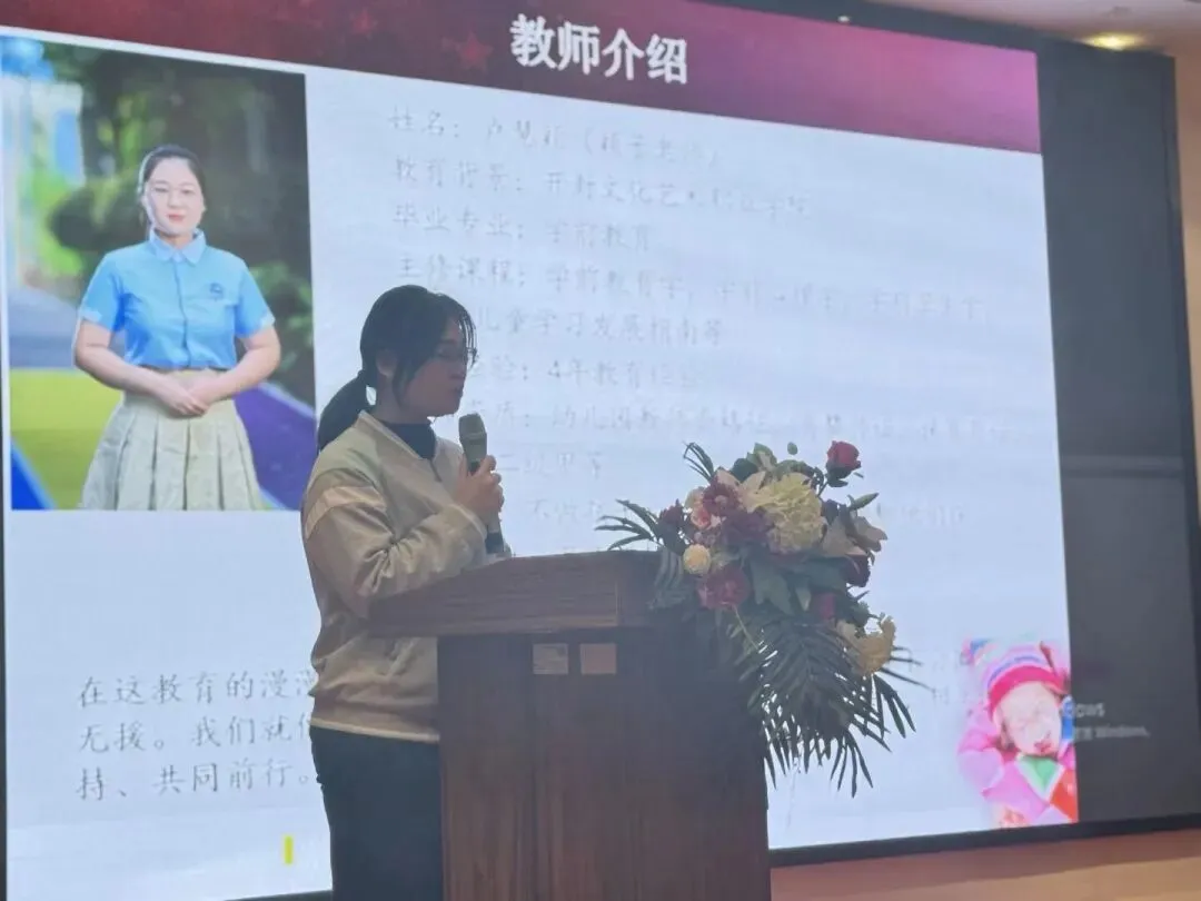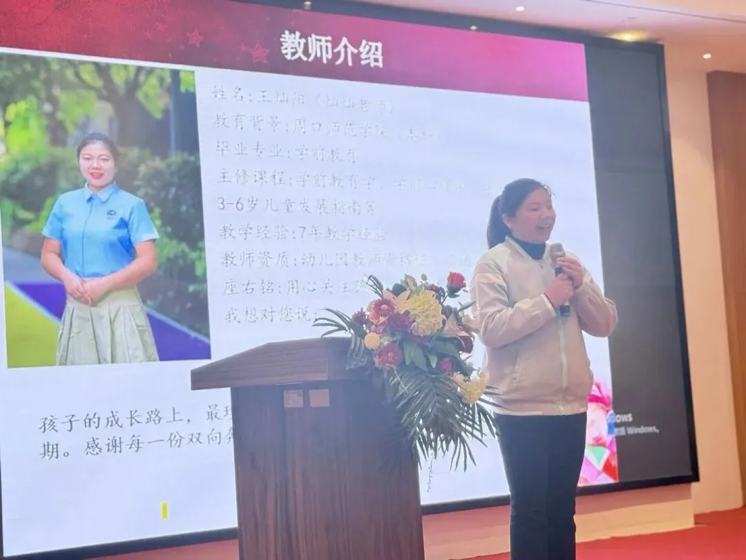王磊园长以热情的态度,率先向新生家长们全面介绍了郑州幼专附属郑新路幼儿园的基本概况、独树一帜的办园特色以及新生入园指南等。她的讲解细致入微,字里行间透露出对幼儿园的深厚情感与自豪,为的是让每一位家长都能通过这场心灵的对话,真正走近郑州幼专附属郑新路幼儿园,深入了解幼儿园的教育理念与育人环境,共同见证孩子们即将踏上的成长之旅。