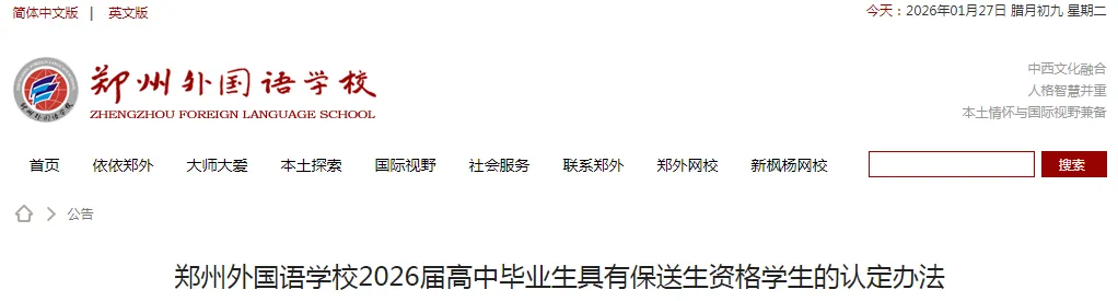 郑州外国语学校正式发布《郑州外国语学校2026届高中毕业生具有保送生资格学生的认定办法》,明确了保送资格的认定办法。