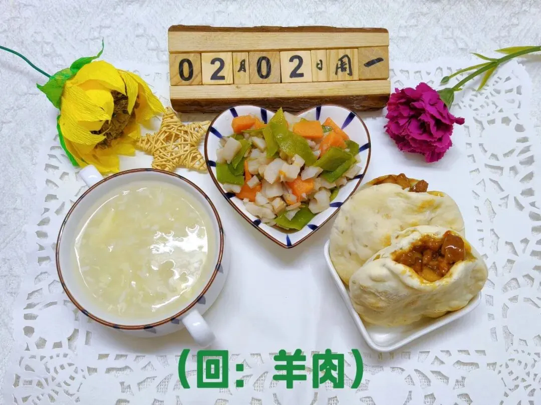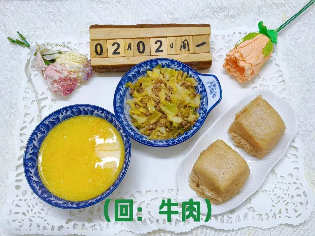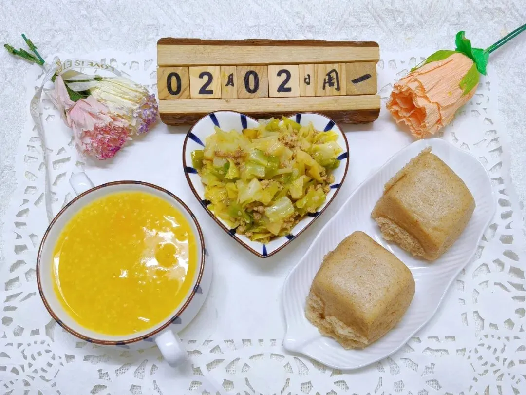 肉沫包菜(回:牛肉)、杂粮馒头、南瓜小米粥