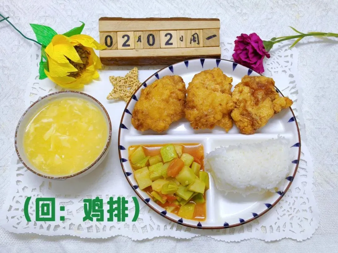 蜜汁排骨(回:鸡排)、米饭、茄汁西葫芦、凤凰玉米羹