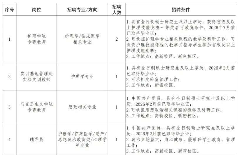 学校现有两个校区——郑州高新校区和新密校区,总占地面积850亩,新密校区的建设被郑州市人民政府及河南省发展和改革委员会确定为重点建设项目之一,现有在校生17000余人。2019年7月,学校护理专业被河南省教育厅评为“河南省品牌专业”;2023年3月,被郑州市教育局评为“郑州市教育系统2022年度平安校园建设先进单位”;2023年4月,被郑州市教育局评为“2022年度郑州市教育系统信访稳定工作先进单位”;2023年5月,被河南省教育厅、河南省平安建设工作领导小组办公室、河南省公安厅评为“2022年省级平安校园”。2021—2023年,我校护理、康复治疗技术、助产、药学、口腔医学技术专业先后被河南省教育厅立项为“河南省普通高校学科专业建设资助项目”。学校每年均组织学生参加河南省教育厅、卫健委举办的技能大赛,并多次荣获“个人奖”“团体奖”和“优秀组织奖”。学校目前拥有一支教学与科研能力突出、职称与年龄结构合理的师资队伍。