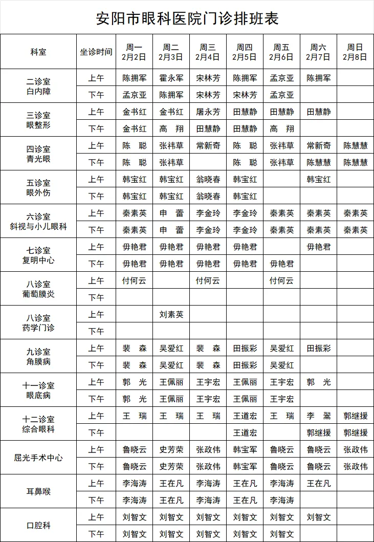 安阳市眼科医院2026年2月2日—2月8日门诊医生出诊信息