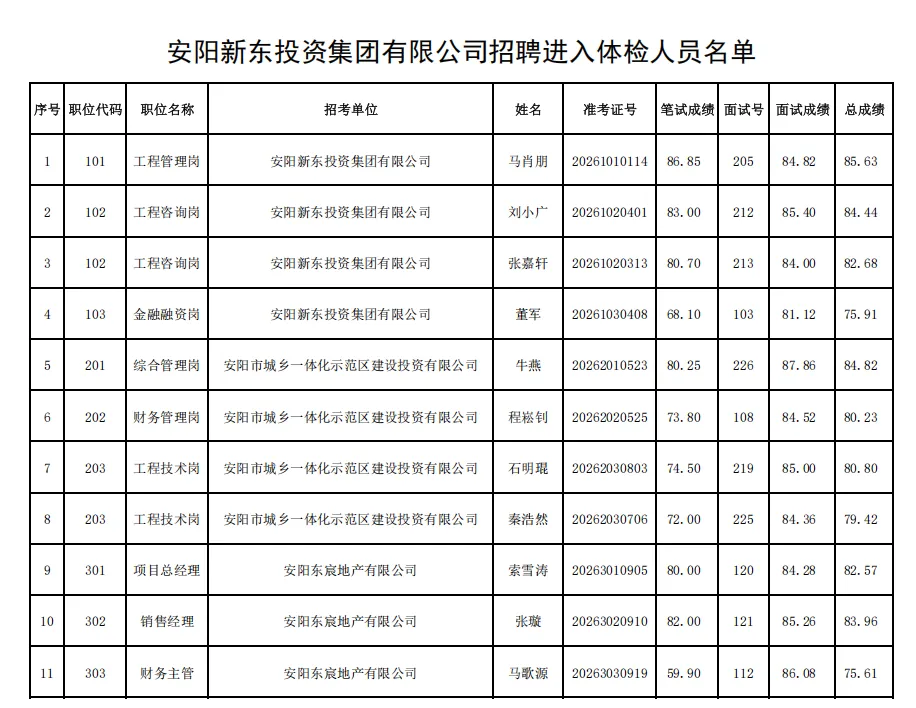 根据《安阳新东投资集团有限公司招聘公告》规定,本次公开招聘面试工作已顺利结束,现将进入体检环节人员名单及体检工作有关事宜通知如下: