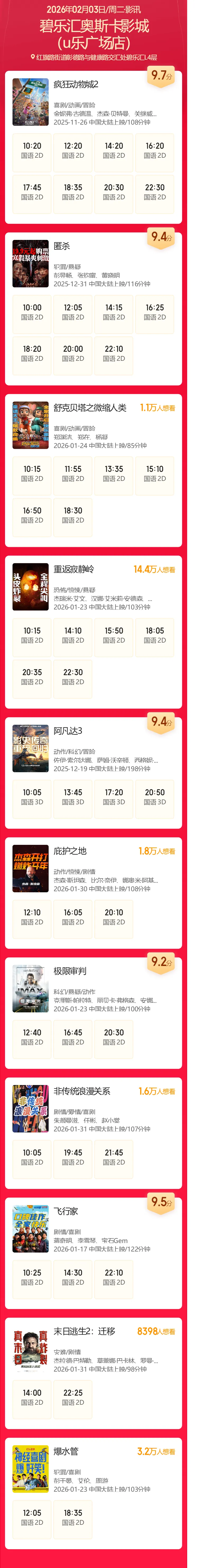 >安阳碧乐汇奥斯卡影城2月3日影讯(影讯仅供参考,具体排片以影院当日播出为准)