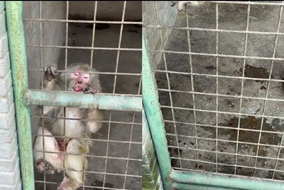 画面中,一只体型较小的猴子被同笼另一只猴子扑打,地上可见血迹与排泄物,拍摄者配文称“小猴子吓得不敢动,短短十分钟被打了四次”,并呼吁园方尽快将两只猴子分开。