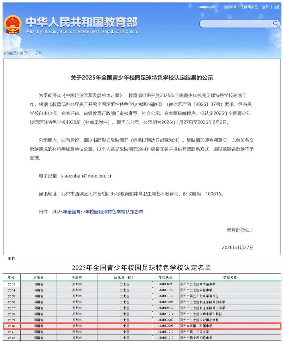 近日,教育部公示2025年全国青少年校园足球特色学校名单,郑州大学第一附属中学成功入选。此前,该校已被确定为2026-2029年河南省体教融合试点学校。连续获得两项重要认定,既是对附属中学体教融合工作的充分肯定,更是学校依托郑州大学“双一流”建设,践行“五育并举”理念、坚守体育育人初心使命的生动体现。
