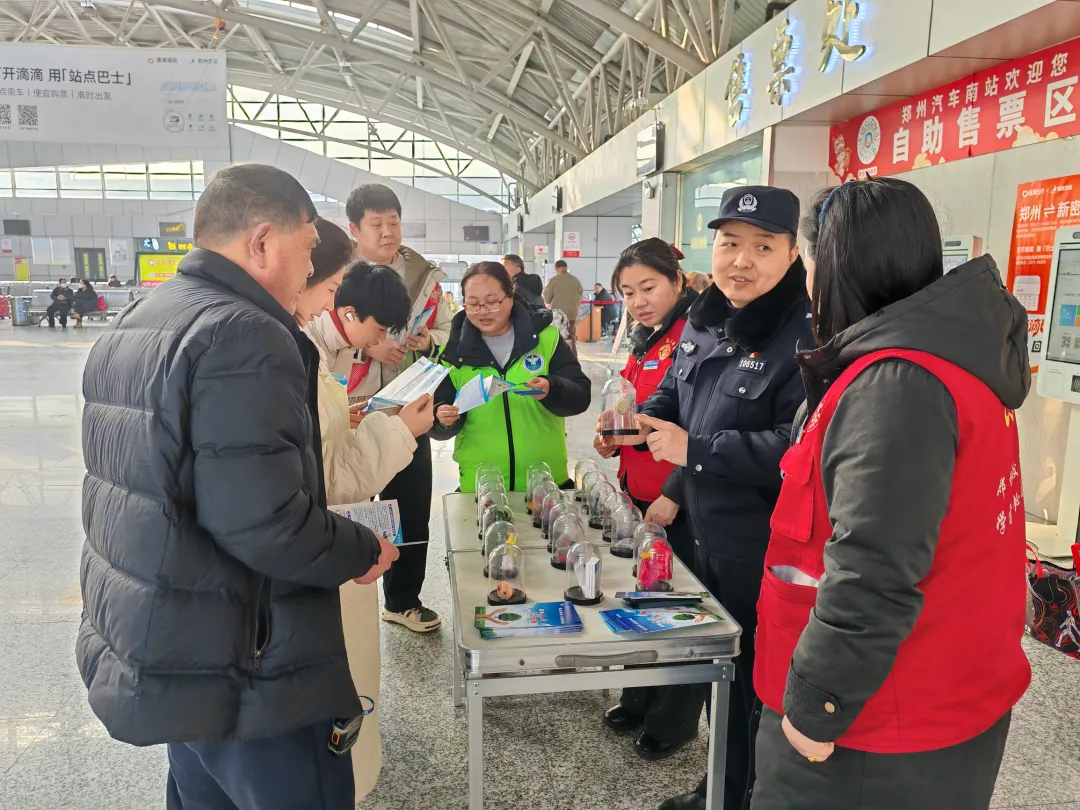 春运大幕今日拉开,归途暖意正渐浓郁。2月2日14点,二七区禁毒大队副大队长苗华辉一行联合橄榄社区工作人员、彩虹禁毒社工来到郑州长途汽车南站共同开展“健康人生 绿色无毒”主题禁毒宣传活动,将专业禁毒知识融入候乘服务全过程,为广大职工与过往旅客送上一堂“零距离、接地气”的安全必修课,用实际行动筑牢春运出行“禁毒网”。