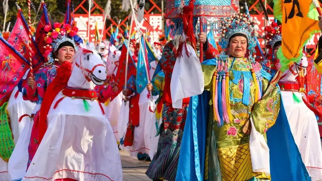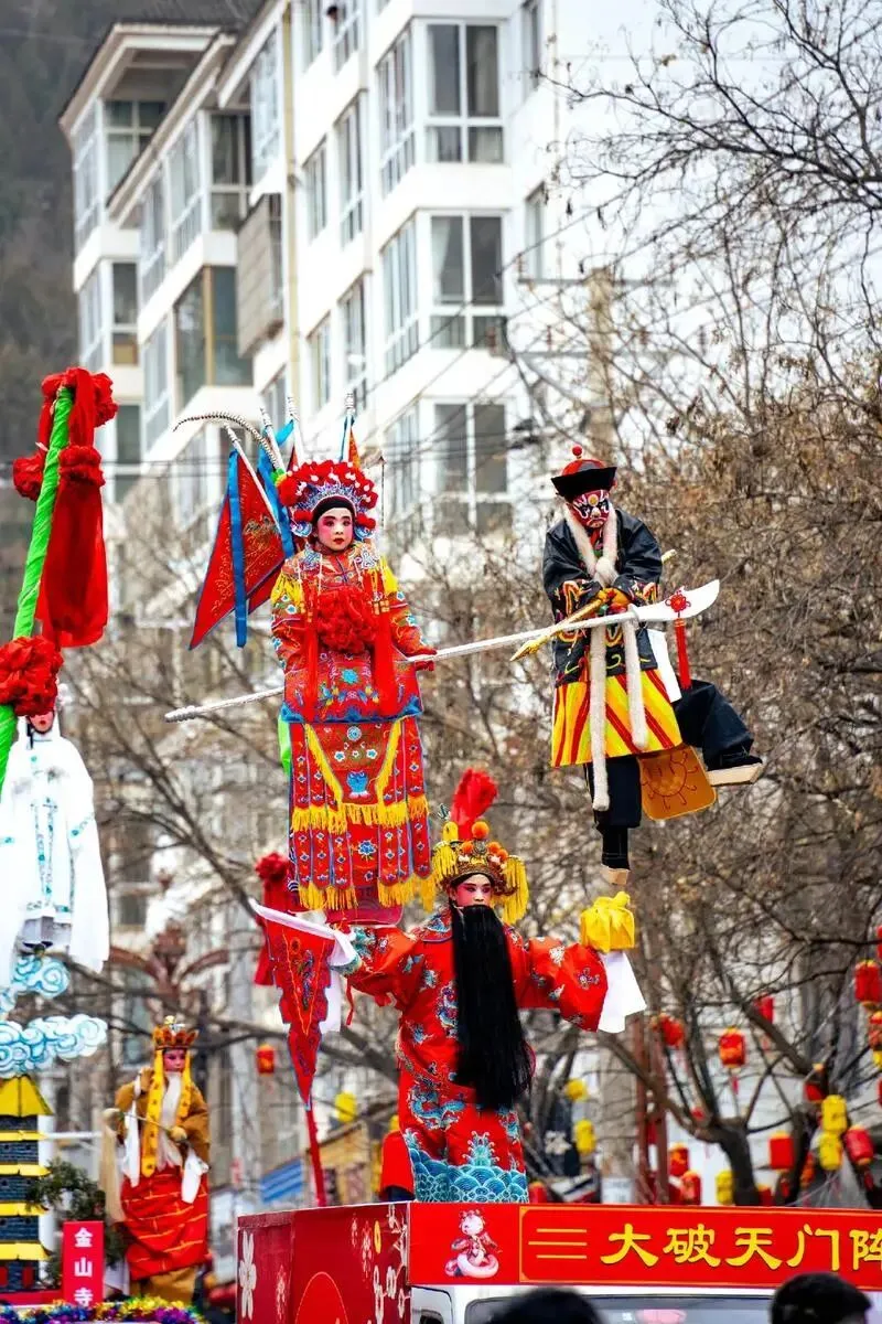 这里的社火表演主打一个"忠烈"主题,杨门女将骑着高头大马巡游,配上激昂的战鼓声......那阵仗,帅到我当场就想喊一声"精忠报国"!