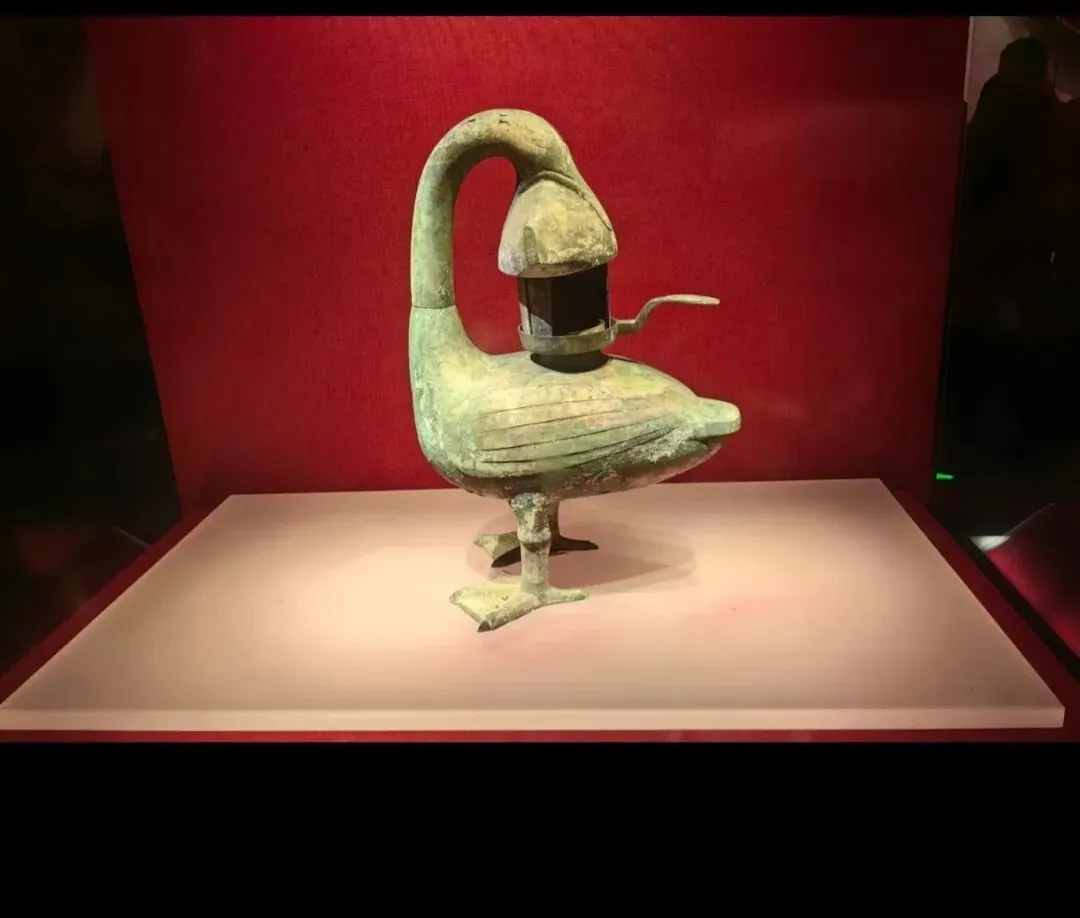 雁鱼灯,灯体设计巧妙,烟尘通过雁颈导入雁腹的水中溶解,实现室内空气净化。灯盘可调节亮度,兼具实用性与环保性。灯体可拆卸清洗,灯罩可转动调节,体现了汉代工匠对流体力学和机械传动的朴素应用。