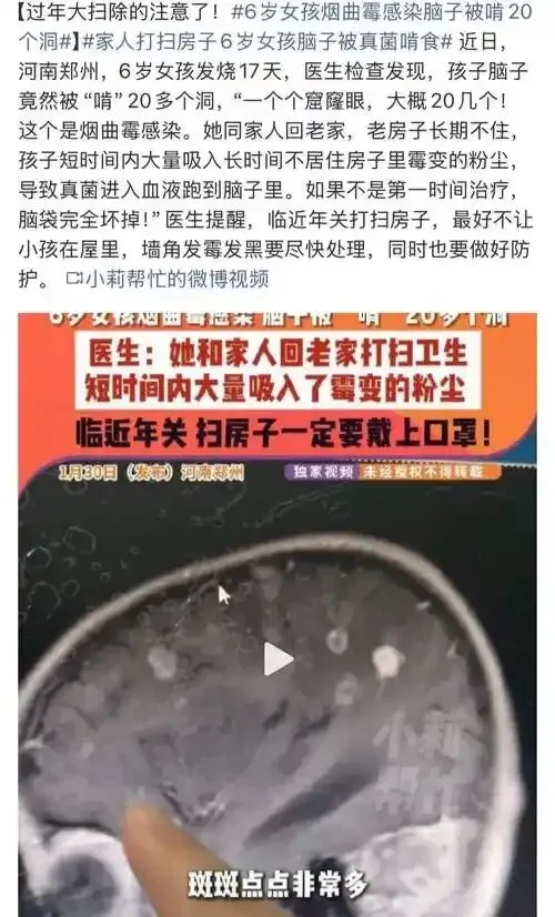 后来去医院检查发现她脑部竟然被霉菌侵蚀出了20多个空洞!