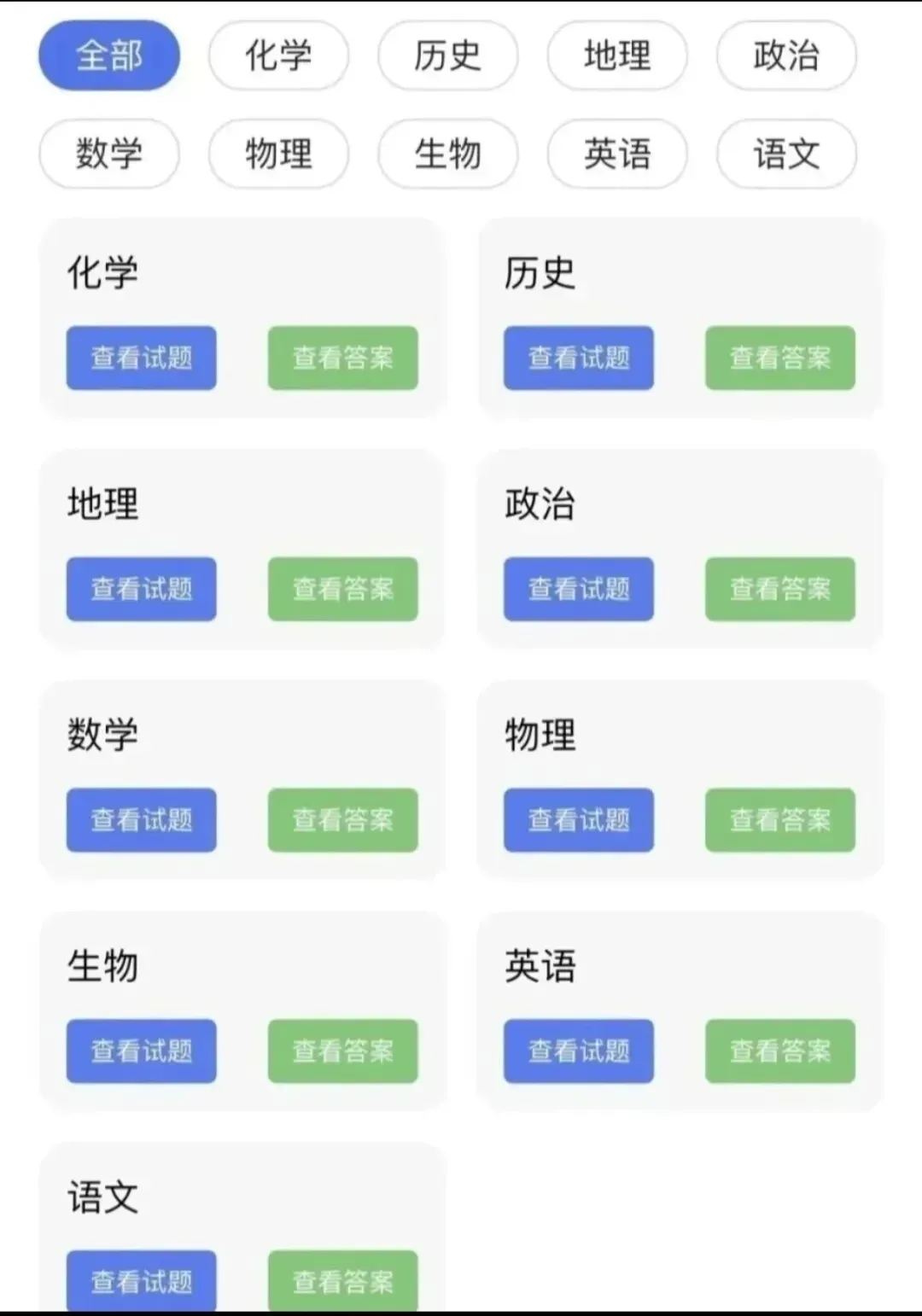 我们会同步更新语文、数学、物理、化学、历史试题及答案,英语、生物、政治、地理科目会陆续更新