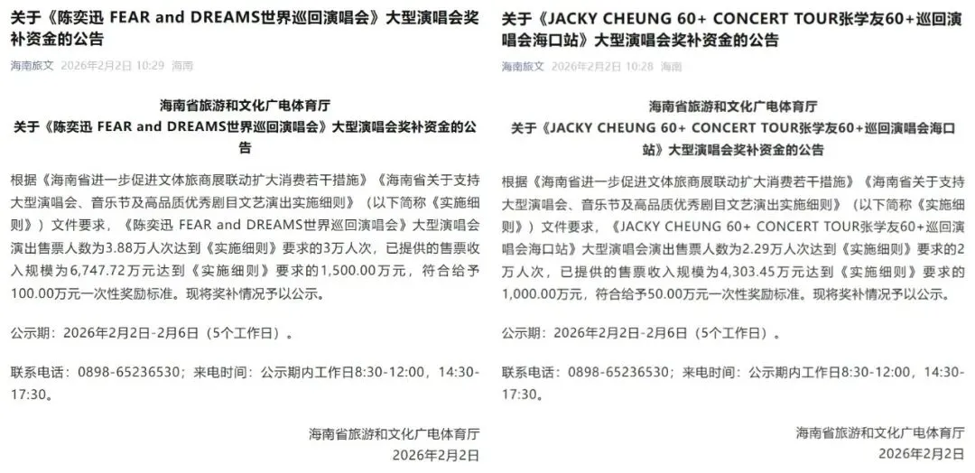 官方公告:陈奕迅、张学友开演唱会分别获100万元、50万元奖励2月2日,海南官方公告:陈奕迅、张学友演唱会分别一次性奖励100万元、50万元,两人演唱会售票人数、收入达到要求。