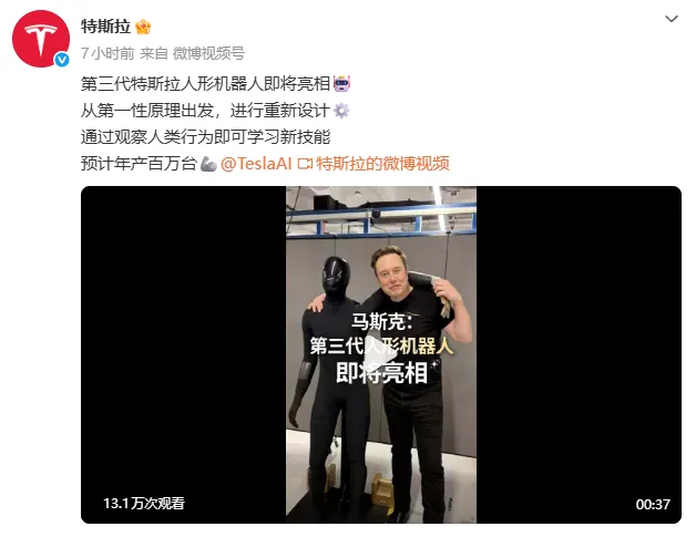 2月2日,据特斯拉官方微博消息,第三代特斯拉人形机器人即将亮相,通过观察人类行为即可学习新技能,预计年产百万台。