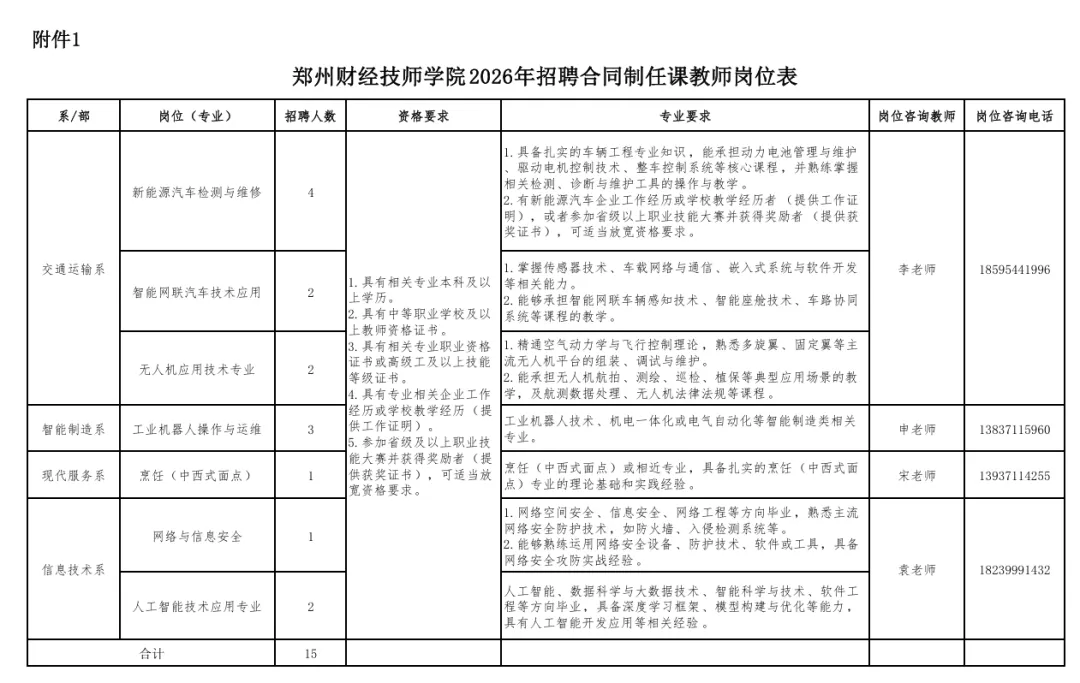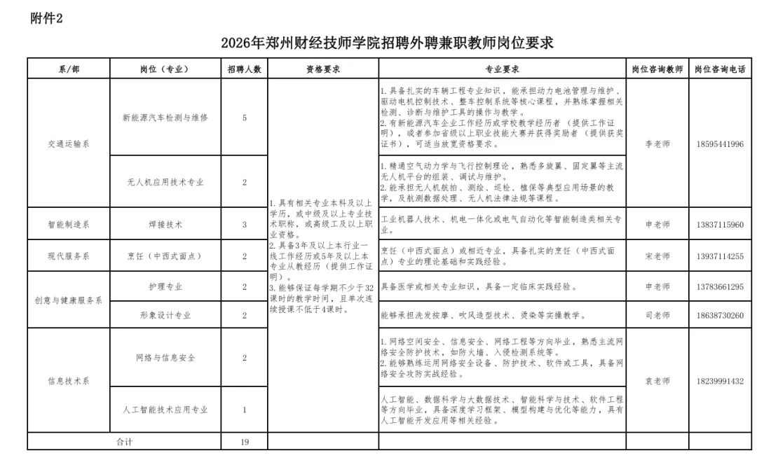 本次招聘合同制任课教师15名,具体岗位及要求详见《郑州财经技师学院2026年招聘合同制任课教师岗位表》(附件1)。招聘外聘兼职教师19名,具体岗位及要求详见《郑州财经技师学院2026年招聘外聘兼职教师岗位表》(附件2)。(相关附件可点击下方链接至学院官网下载)