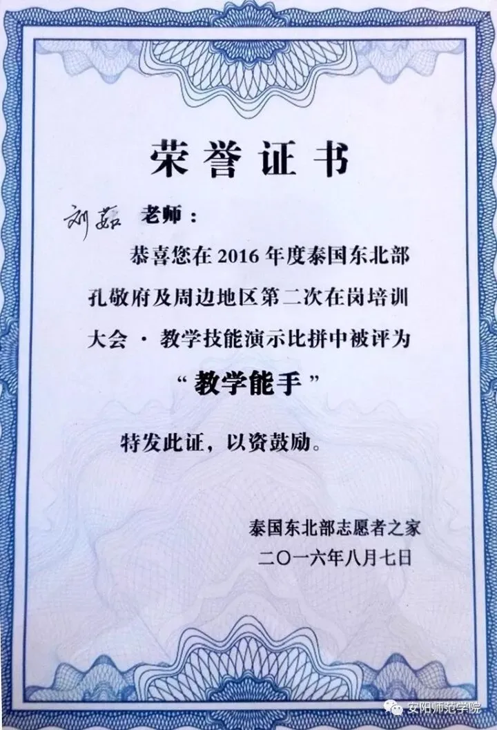 2015级研究生刘茹在泰国教学技能比赛中荣获“教学能手”