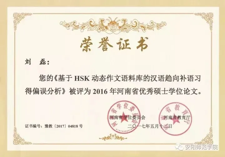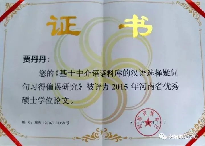 2012级张超、2013级贾丹丹和2014级刘磊的硕士毕业论文被评为当年河南省优秀硕士学位论文