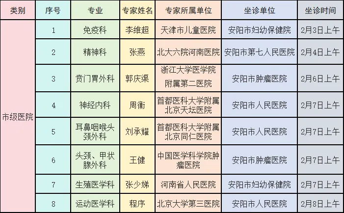 为满足我市人民群众多层次就医需求,建设高水平人才队伍,促进公立医院高质量发展,安阳市卫生健康委员会组织开展“名院名医伴飞计划”项目。通过市直医疗机构和国内知名医院专家团队的深度合作,引进了神经外科、神经内科、骨科、心内科(电生理)、呼吸内科、普外科(肝胆胰外科)、胸外科(肺)、乳腺外科、结直肠外科、中医儿科、中医脾胃科、中医骨伤科、心内科(冠心病)、耳鼻喉科、生殖医学科、精神科等专业国内第一梯队的名院名医,在市人民医院、市肿瘤医院、市中医院、市三院、市六院、市妇幼保健院、市七院等市直医疗机构定期坐诊、手术,旨在减轻我市群众外地就医的负担,让老百姓就近享受优质医疗资源,不断提升群众就医的获得感和幸福感。