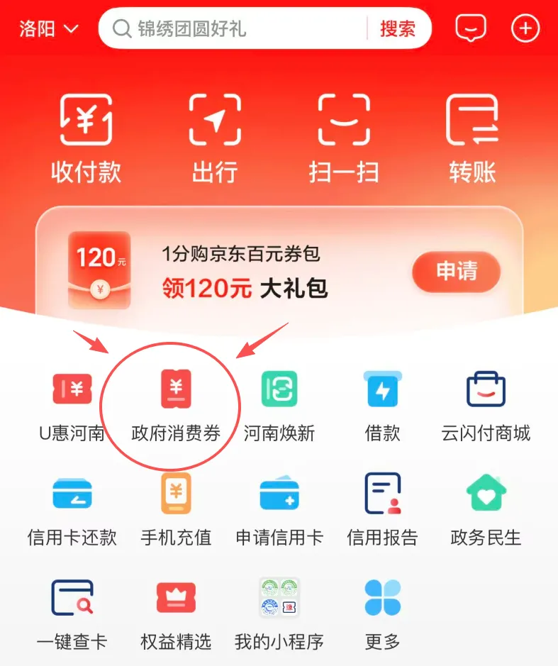 消费者通过位置信息校验确定在洛阳市内,使用云闪付APP在我市参与活动的门店进行商超、餐饮、住宿、加油、百货类消费,支付单次金额在100元以上,即可领取“新春大礼包”一份。