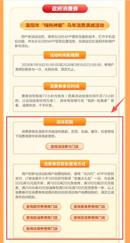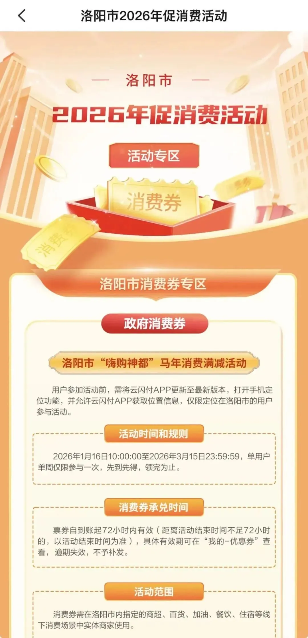 2.消费券可在洛阳市辖区内参与活动的任一商家核销使用,参与商家须支持发放平台付款方式。