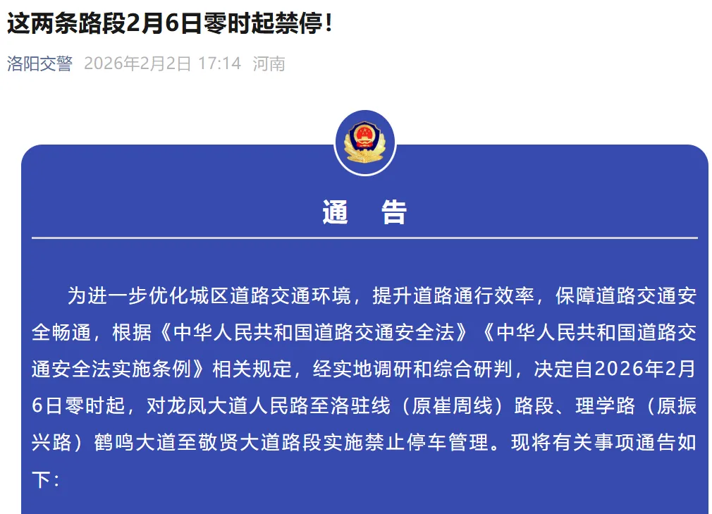 为进一步优化城区道路交通环境,提升道路通行效率,保障道路交通安全畅通,根据《中华人民共和国道路交通安全法》《中华人民共和国道路交通安全法实施条例》相关规定,经实地调研和综合研判,决定自2026年2月6日零时起,对龙凤大道人民路至洛驻线(原崔周线)路段、理学路(原振兴路)鹤鸣大道至敬贤大道路段实施禁止停车管理。现将有关事项通告如下: