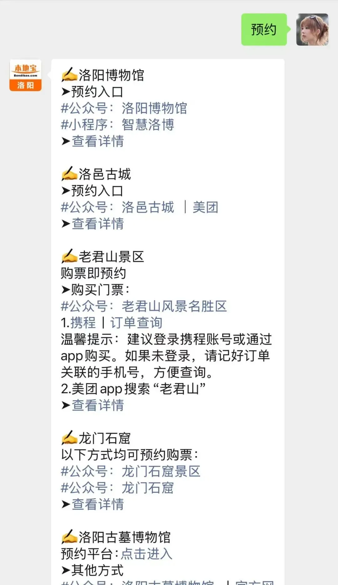 进入【洛阳本地宝】公众号,在公众号聊天框发送【洛阳博物馆】,即可查看预约入口。