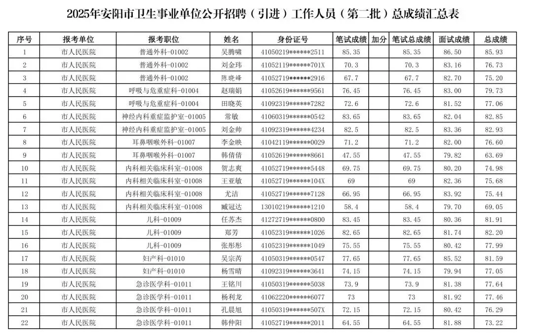 根据2025年安阳市卫生事业单位公开招聘(引进)工作人员(第二批)工作计划安排,笔试、面试工作已顺利结束。按照《2025年安阳市卫生事业单位公开招聘(引进)工作人员(第二批)简章》规定,我委对笔试、面试成绩进行了核准并对考试总成绩进行计算汇总,现将结果予以公布。