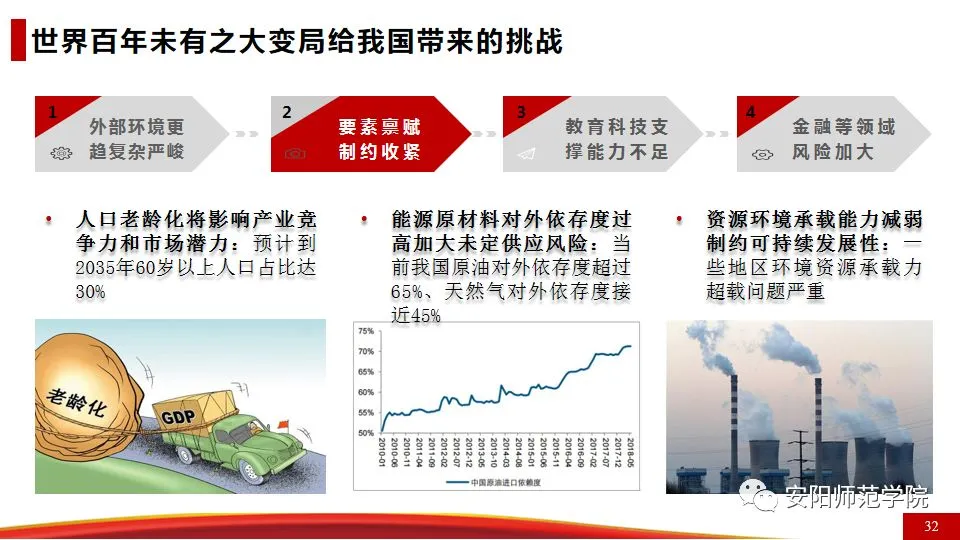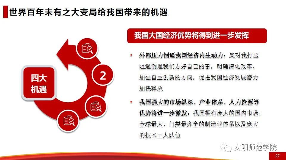 刘伟指出,开展好“不忘初心、牢记使命”主题教育是党的十九大作出的重大决策部署,要把思想和行动统一到中央和省委精神上来,坚持高标准、重实效,推动第二批主题教育高质量开展。对广大师生来说,以实际行动践行好初心和使命,关键是要做到坚定中国特色社会主义道路自信、理论自信、制度自信、文化自信。就如何学习贯彻党的十九届四中全会精神,刘伟强调,要深刻领会中国特色社会主义制度和国家治理体系的显著优势,准确把握坚持和完善中国特色社会主义制度、推进国家治理体系和治理能力现代化的总体要求、总体目标和重点任务,在深入学习上下功夫、在研究谋划上下功夫、在提高能力上下功夫、在落细落实上下功夫。刘伟指出,“百年未有之大变局”反映了以习近平同志为核心的党中央对世情和国情的深刻把握,主要表现为全球格局逐步演变,大国关系深刻调整;经济全球化遭遇挑战,国际经济循环和产业分工面临重构;新一轮科技革命和产业变革兴起,生产方式和社会治理模式面临深刻调整;全球治理体系和国际秩序加速调整,权利和责任将被重新分配等方面,这为我国带来了较好的外部发展空间、大国经济优势将得到进一步发挥、新一轮技术革命和产业变革将带来跨越式发展、我国在全球治理体系中的地位将进一步提升等机遇。同时,外部环境更趋复杂严峻、要素禀赋制约收紧、教育科技支撑能力不足、金融等领域风险加大等问题也更加凸显。通过大量实例和详实的数据对比,刘伟强调,新中国成立70年来,河南省从一穷二白到全国第五经济大省,综合实力显著提升;从投资拉动到“三驾马车”协同发力,经济增长动力不断增强;从单一农业结构到百业兴旺,产业结构持续优化升级;从城乡分割到融合推进,区域协调发展呈现新格局;从封闭半封闭到全方位对外开放,开放型经济水平明显提高;从温饱不足迈向全面小康,人民生活焕然一新,产业基础优势、区域交通优势、开放通道优势、战略叠加优势、市场规模优势日趋明显,河南在全国发展大局中的地位日益突出。当前,我省经济发展呈现出经济运行保持平稳、结构调整持续优化、质量效益继续改善、发展动能不断增强的态势。总体上看,我省经济发展的基本面持续向好,特别是创新、协调、绿色、开放、共享等新发展理念深入人心,黄河流域生态保护和高质量发展、中部地区崛起、郑州航空港经济综合实验区等一大批重大战略加快推进,减税降费、转型升级、改革开放等一系列政策措施加力增效,未来河南经济社会发展前景广阔、大有可为。