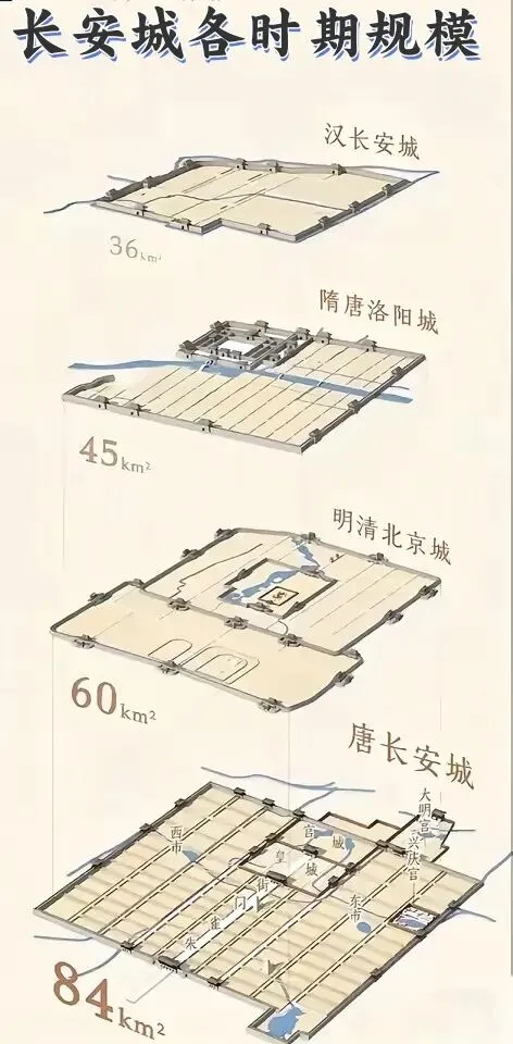 第三是从城市规模与人口来比较洛阳城与长安城。据城镇规划君何方洪查询相关的历史书籍资料,长安城当时的城市面积约84平方公里,这个城市规模可是当时世界上最大的城市,常住人口高达百万,包括了宫廷、官吏、军队、贵族和商人及外国人,长安城的人口以非生产性群体为主,消费型特征十分显著。盛唐长安城以84平方公里的恢弘格局雄踞世界城市之巅,百万常住人口的规模在彼时堪称空前的存在,这份百万人口大城市的体量放在千年前的时代背景下,更显震撼的超级“恐怖”。