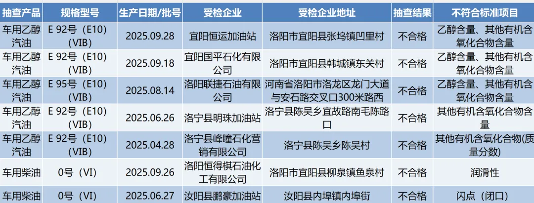 据公告数据,本次共检测汽油67批次,其中不合格5批次,主要不合格原因集中在乙醇含量和其他有机含氧化合物含量;柴油66批次,其中不合格2批次,不合格原因分别是润滑性和闪点(闭口)。不合格批次如下: