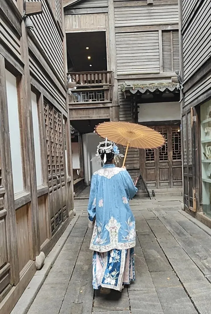 最触动我的,是在一家民俗馆里,看到了福州传统妇女的“三把刀”头饰。那高耸的发髻上插着三支像刀一样的簪子,竟藏着一段壮烈的传说:听店家说,当年倭寇侵扰,妇女们把利器藏在发间,既能防身,也能护家、卫国。当我戴上那沉甸甸的“三把刀”,配上蓝色襦裙,慢慢走到巷子的青石板上时,周围的喧闹忽然安静了。耳边仿佛响起遥远的金属低鸣,又像传来谁家母亲的呼唤。这身装扮,不再只是橱窗里的展览,它让我触碰到这片土地上,那些柔软身体里曾经迸发出的、守护日常的刚烈勇气。这何尝不是最深沉的“烟火气”呢?它要护住的,不过是一盏灯、一炊饭、一个小家的平安。