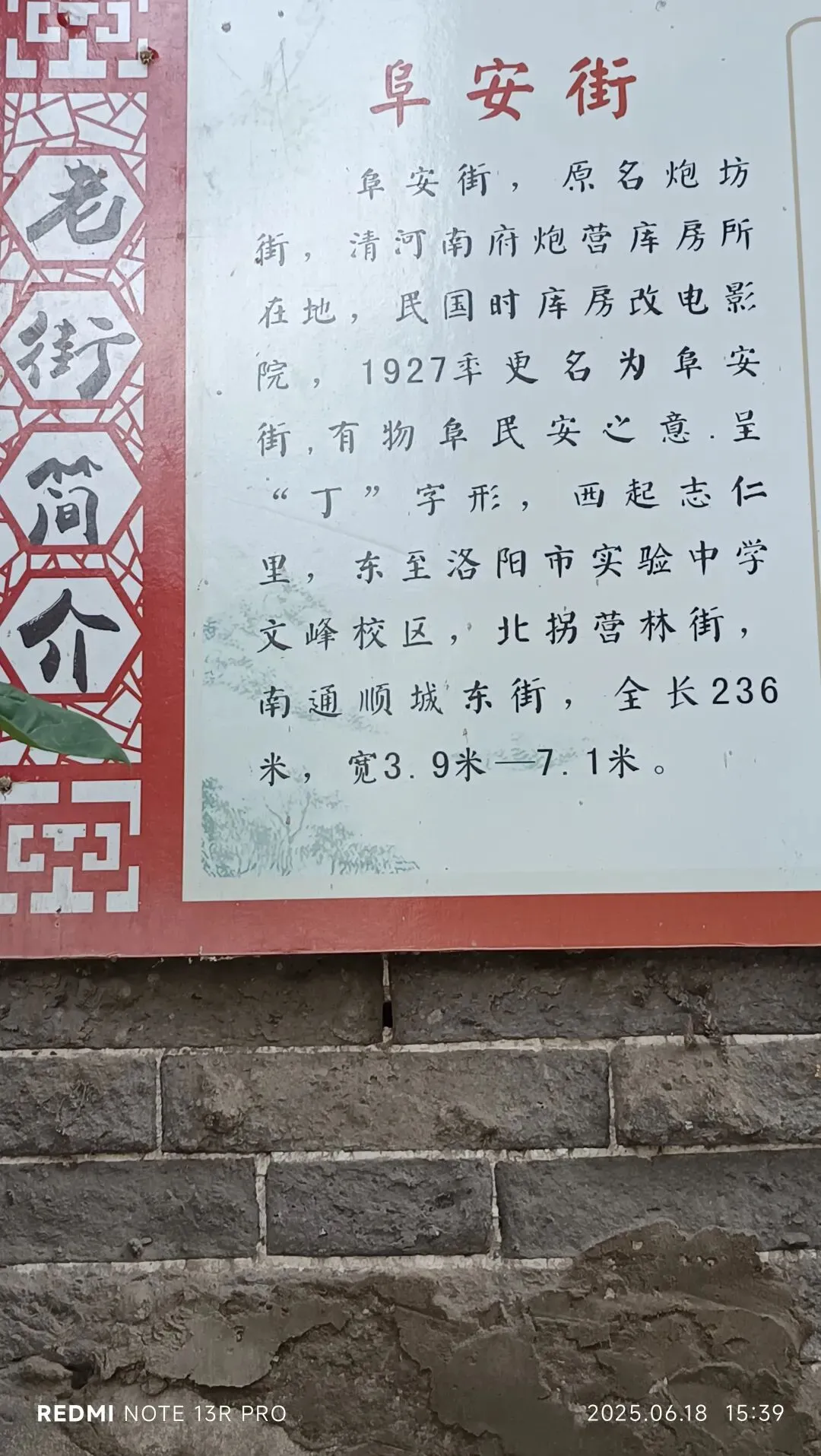 在这里必须先介绍一下阜安街附近的比邻,这里是明代河南卫、清代河南营的指挥中枢所在地,俗称南大营(现为洛阳市实验中学的文峰校区)。阜安街就在南大营西侧,南北向的一条小街,明代为卫右街,清代为营坊胡同。1927年,并入阜安街。营坊胡同,原街道长宽与今敦志街相同。