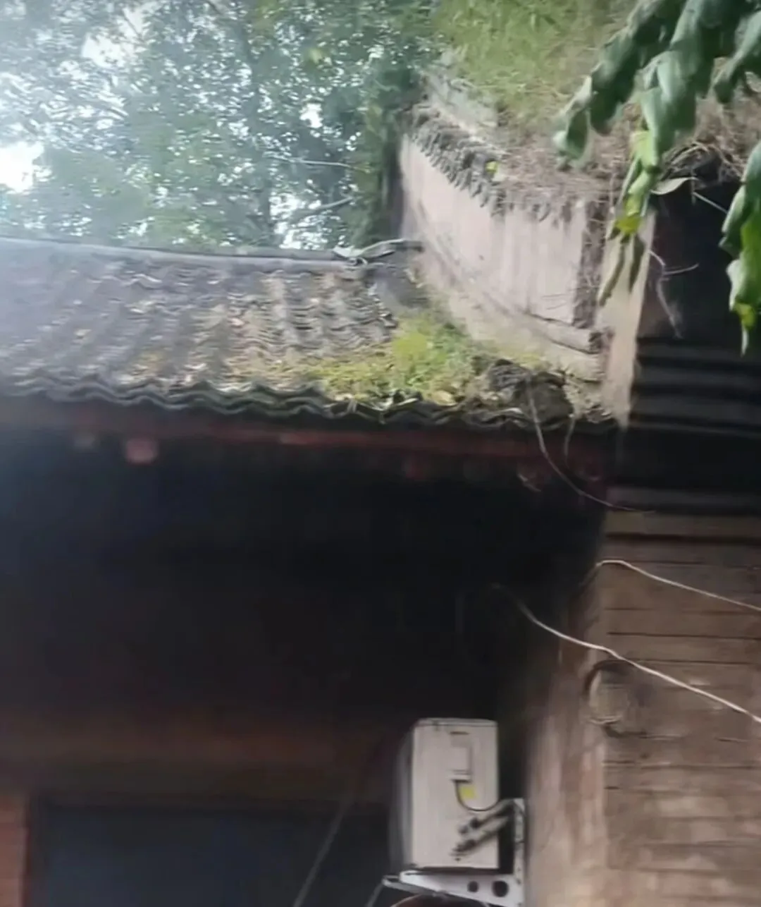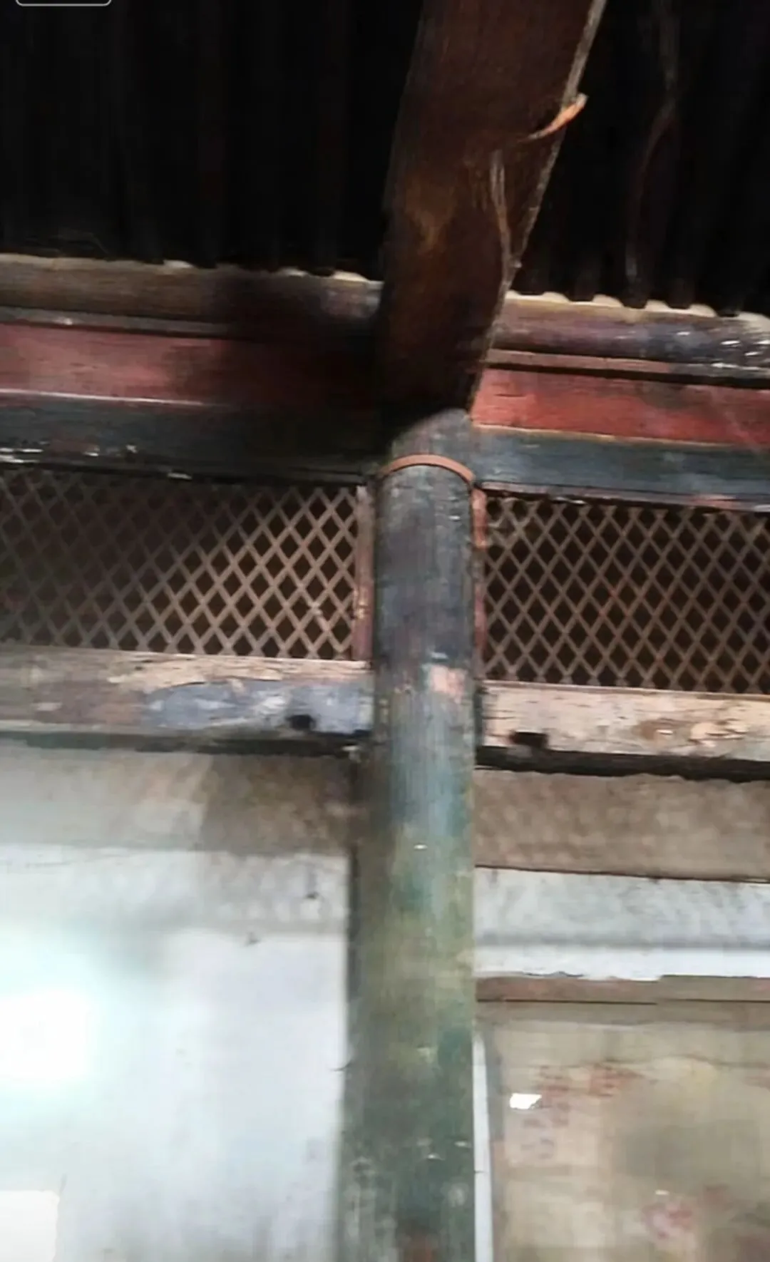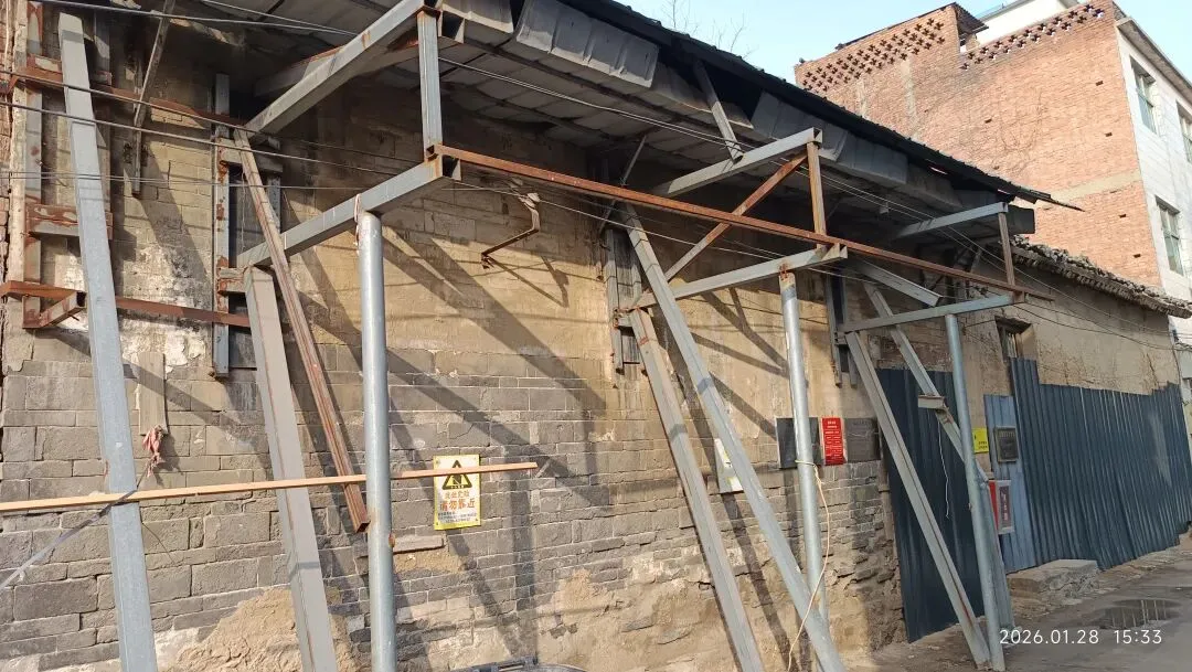 你走近会发现,它目前的状况不佳,有钢架支撑和保护,似要倾倒。房顶也用铁皮防护,防止瓦片掉落。