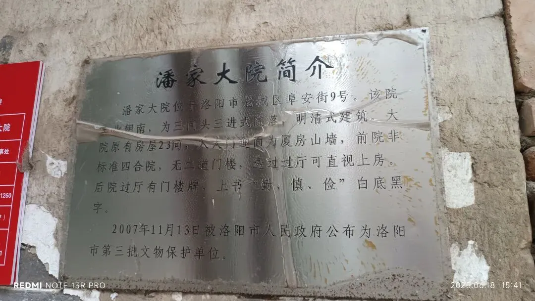 踏入洛阳老城区阜安街,喧嚣渐远。最近在西南隅探访,已经介绍了营林街的史家大院和庄家大院。今天来到庄家大院后面的阜安街,行至9号门前,抬头可见“潘家大院”的标识。这座市级文物保护单位,虽不及山西那些名声在外的晋商大院宏伟,却以其独特的豫西民居风貌和深厚的文化底蕴,成为老城区古建筑群中一颗璀璨的明珠。