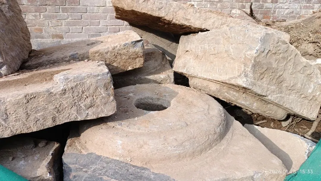 路边临时堆放了不少巨大的柱础和石块,应该是改造过程中挖掘的曾经建筑材料。
