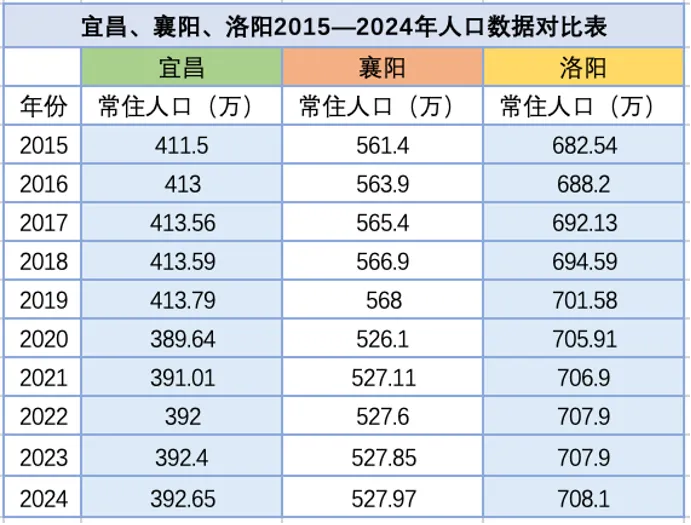宜昌、襄阳、洛阳2015—2024年人口数据对比表(图源@中经数据)▼