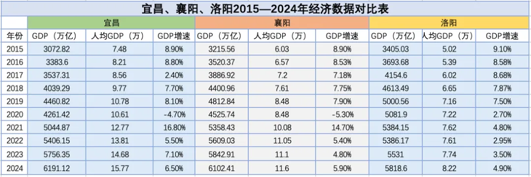 宜昌、襄阳、洛阳2015—2024年经济数据对比表(图源@中经数据)▼