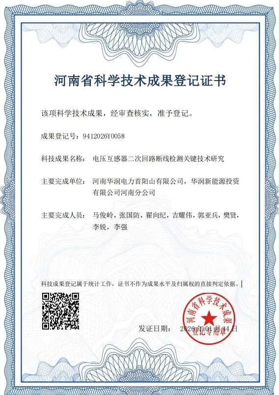 近日,公司与河南新能源公司联合研发的“电压互感器二次回路断线检测关键技术研究”项目,获河南省科学技术厅认定并完成省级科技成果登记。该项目是区域公司在河南省登记的首个科技项目,标志着公司在电力核心技术自主创新与成果管理方面取得了体系化突破。