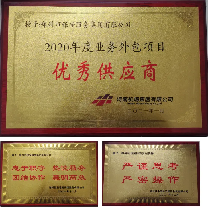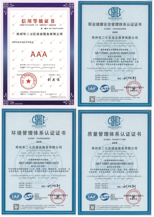 公司成立以来,以“着眼未来、创新发展,忠诚可靠、维护平安”为理念,以“以资兴业,优质高效”为经营核心,抓管理、带一流队伍,重服务、创一流业绩,深耕细作,成绩斐然。公司具有AAA级信用等级证书,通过ISO9001:2015质量管理体系认证、环境管理体系认证、职业健康安全管理体系认证,为河南省保安协会会员单位、郑州市保安协会会长级理事单位。公司以诚信、安全、专业、创新的态度与追求,期待与您携手发展,共创未来。